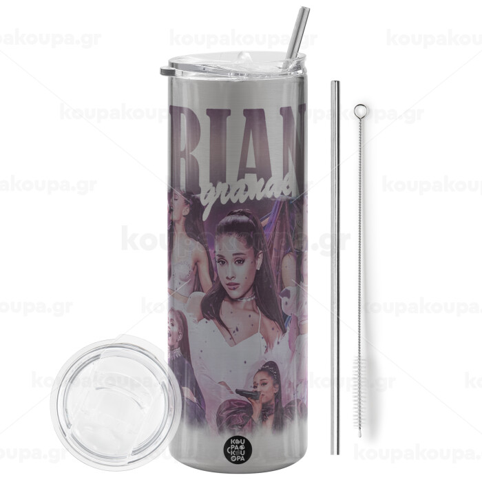 Ariana Grande, Tumbler stainless steel Silver 600ml, with metal straw & cleaning brush