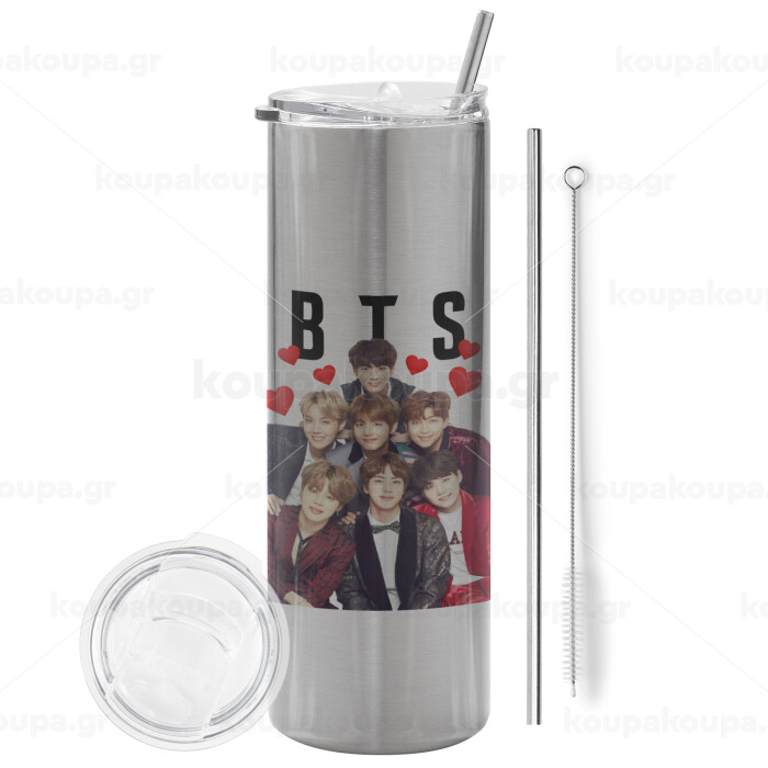 BTS hearts, Tumbler stainless steel Silver 600ml, with metal straw & cleaning brush