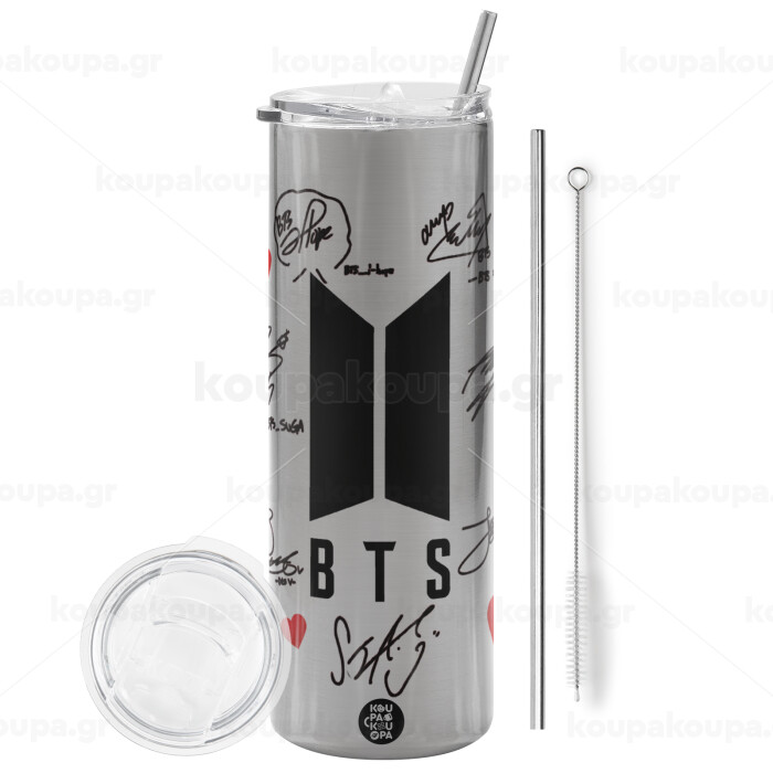 BTS signs, Tumbler stainless steel Silver 600ml, with metal straw & cleaning brush