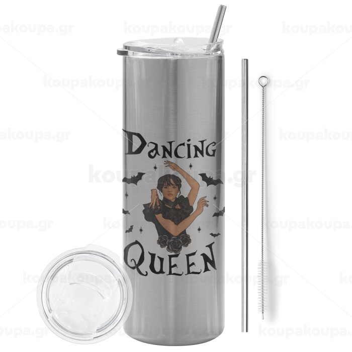 Wednesday Addams Dance, Tumbler stainless steel Silver 600ml, with metal straw & cleaning brush