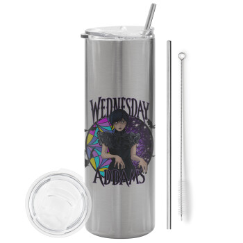 Wednesday Jenna Ortega, Tumbler stainless steel Silver 600ml, with metal straw & cleaning brush