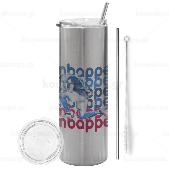 Kylian Mbappé, Tumbler stainless steel Silver 600ml, with metal straw & cleaning brush