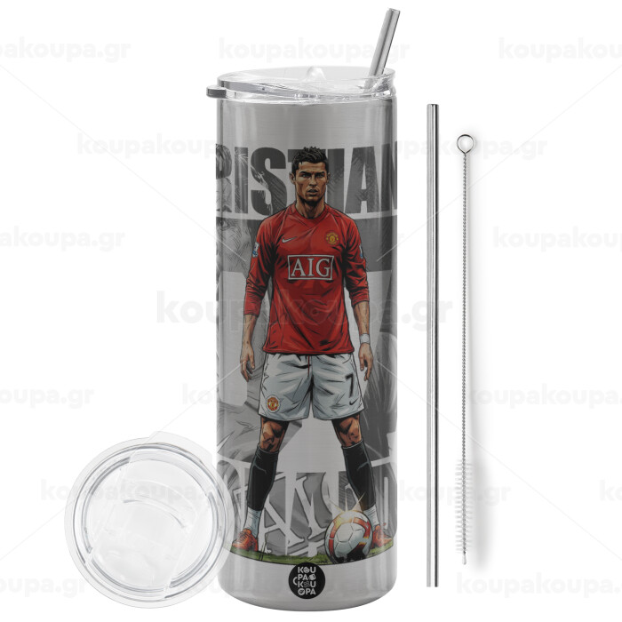 Cristiano Ronaldo (Κριστιάνο Ρονάλντο), Tumbler stainless steel Silver 600ml, with metal straw & cleaning brush