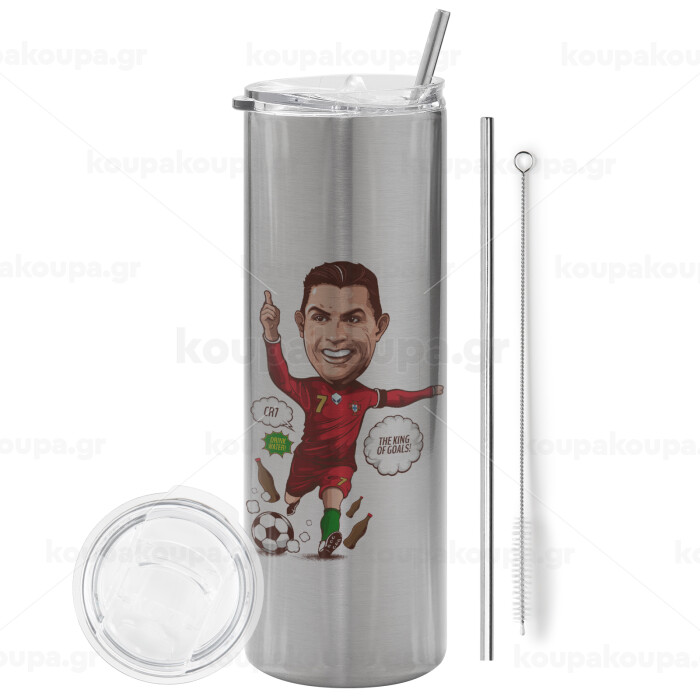 Cristiano Ronaldo, Tumbler stainless steel Silver 600ml, with metal straw & cleaning brush
