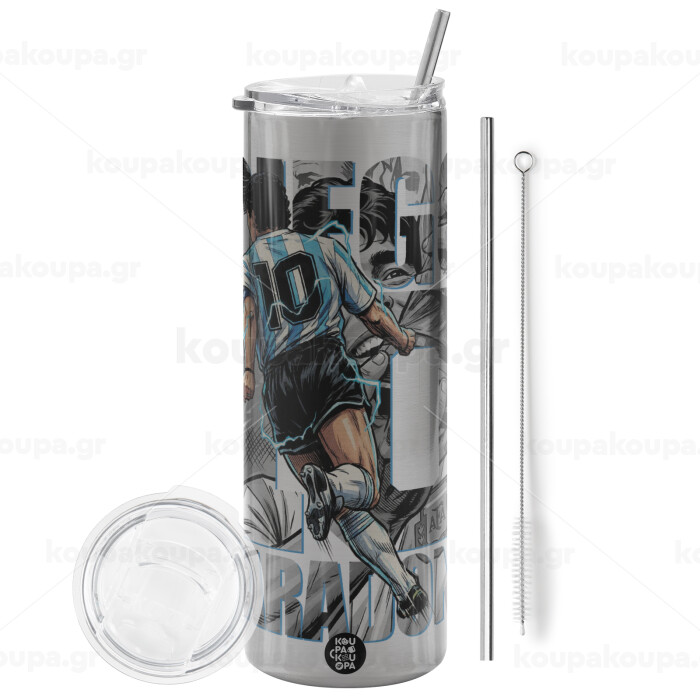 Diego Maradona (Ντιέγκο Μαραντόνα), Tumbler stainless steel Silver 600ml, with metal straw & cleaning brush
