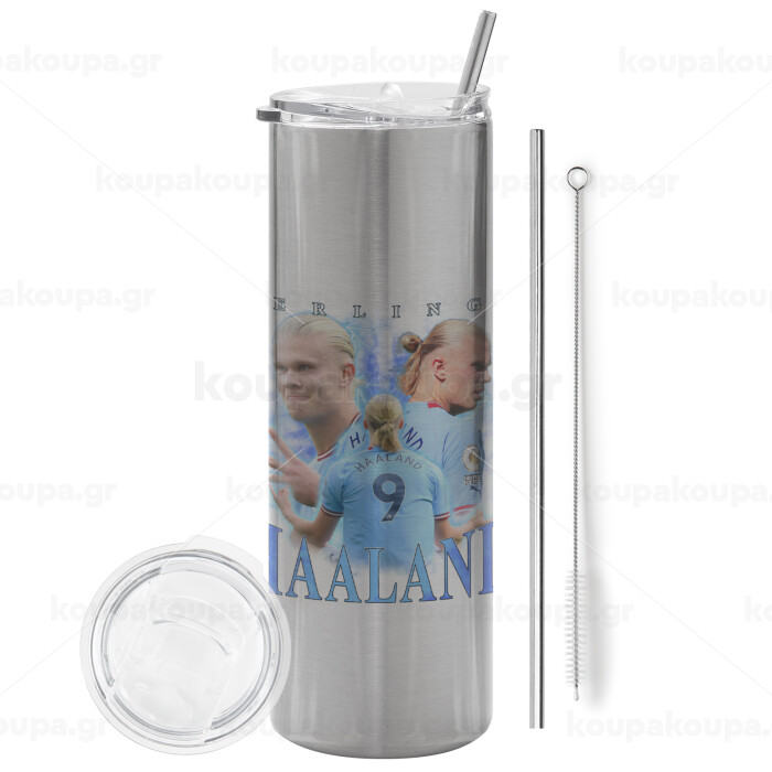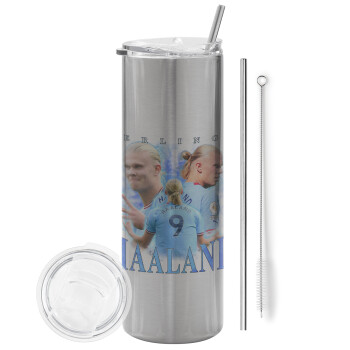 Erling Haaland, Tumbler stainless steel Silver 600ml, with metal straw & cleaning brush