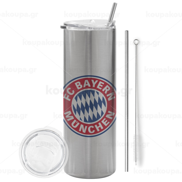 FC Bayern Munich, Tumbler stainless steel Silver 600ml, with metal straw & cleaning brush