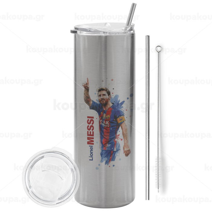Lionel Messi, Tumbler stainless steel Silver 600ml, with metal straw & cleaning brush