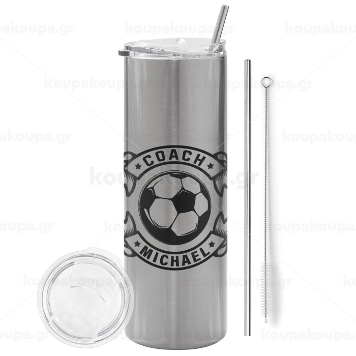 Soccer coach, Tumbler stainless steel Silver 600ml, with metal straw & cleaning brush