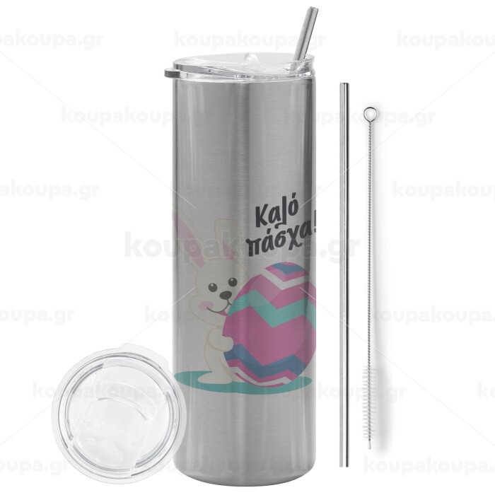 Καλό πάσχα, Tumbler stainless steel Silver 600ml, with metal straw & cleaning brush