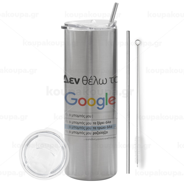 Δεν θέλω το Google, ο μπαμπάς μου..., Tumbler stainless steel Silver 600ml, with metal straw & cleaning brush