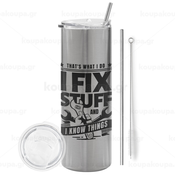 I fix stuff, Tumbler stainless steel Silver 600ml, with metal straw & cleaning brush