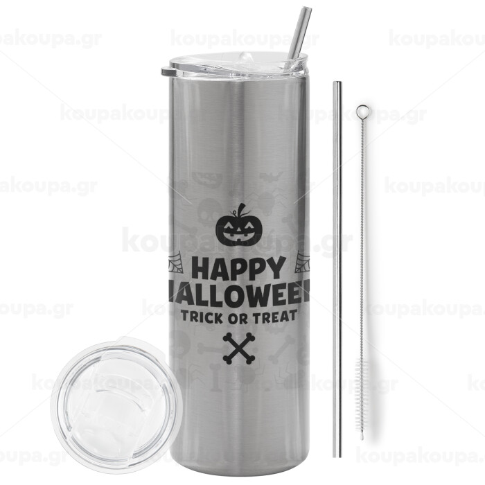 Happy Halloween pumpkin, Tumbler stainless steel Silver 600ml, with metal straw & cleaning brush