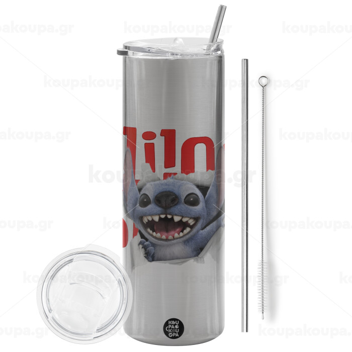 Stitch movie, Tumbler stainless steel Silver 600ml, with metal straw & cleaning brush