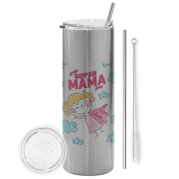 Στην SUPER μαμά μου, comic, Tumbler stainless steel Silver 600ml, with metal straw & cleaning brush