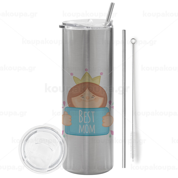 Best mom Princess, Tumbler stainless steel Silver 600ml, with metal straw & cleaning brush