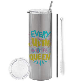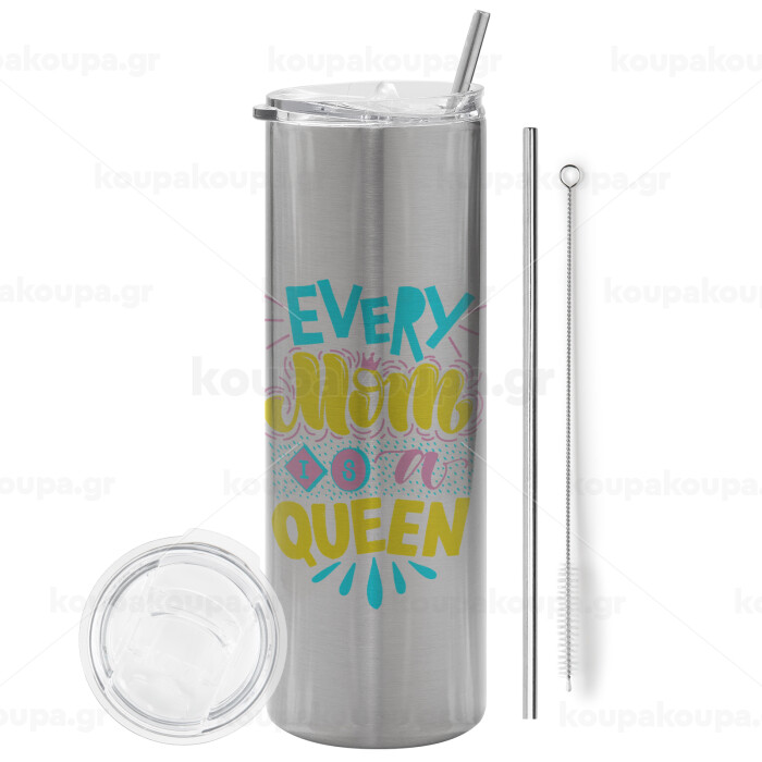 Every mom is a Queen, Tumbler stainless steel Silver 600ml, with metal straw & cleaning brush