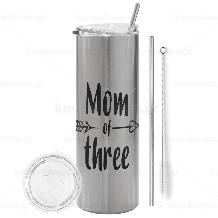 Mom of three, Tumbler stainless steel Silver 600ml, with metal straw & cleaning brush