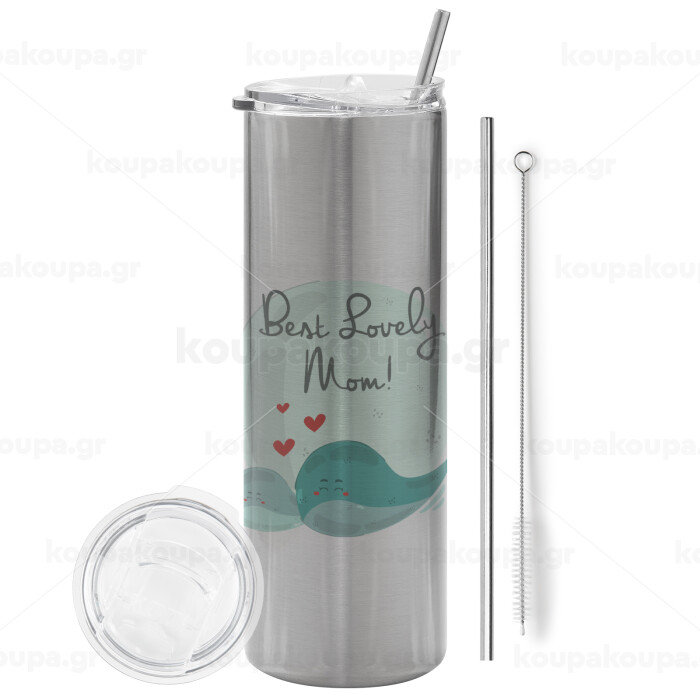 Mothers Day, whales, Tumbler stainless steel Silver 600ml, with metal straw & cleaning brush