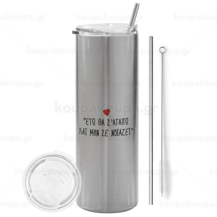 ΕΓΩ ΘΑ Σ’ΑΓΑΠΩ ΚΑΙ ΜΗΝ ΣΕ ΝΟΙΑΖΕΙ..., Tumbler stainless steel Silver 600ml, with metal straw & cleaning brush