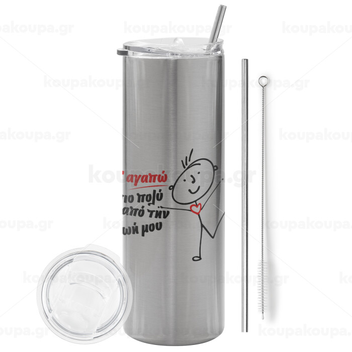 Σ'αγαπώ πιο πολύ από την ζωή μου!!!, Tumbler stainless steel Silver 600ml, with metal straw & cleaning brush