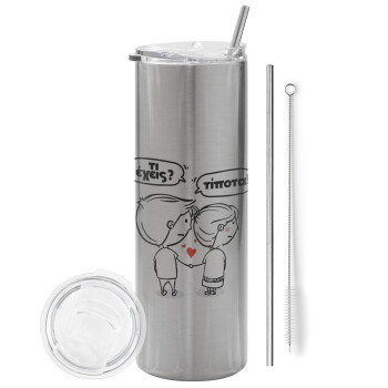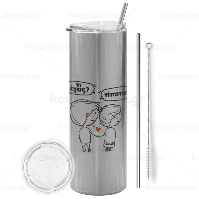 Τι έχεις? Τίποτα!, Tumbler stainless steel Silver 600ml, with metal straw & cleaning brush