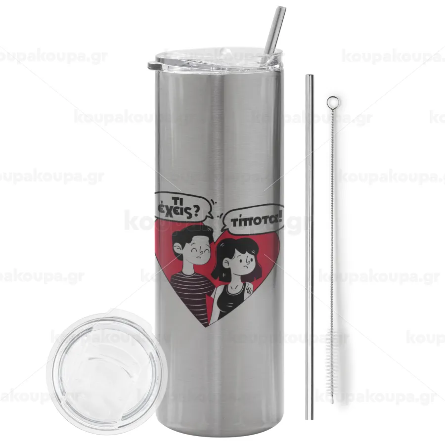 Τι έχεις? Τίποτα!, Tumbler stainless steel Silver 600ml, with metal straw & cleaning brush