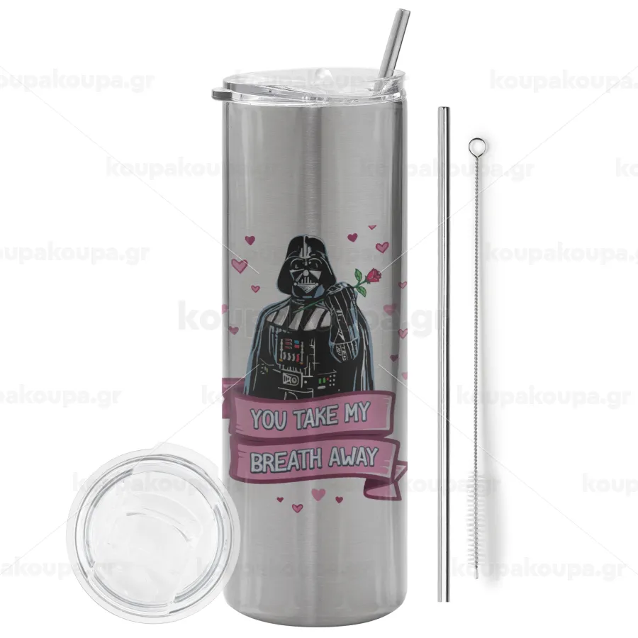 Darth Vader, you take my breath away, Tumbler stainless steel Silver 600ml, with metal straw & cleaning brush