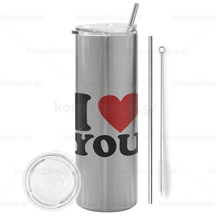 I LOVE YOU, Tumbler stainless steel Silver 600ml, with metal straw & cleaning brush