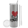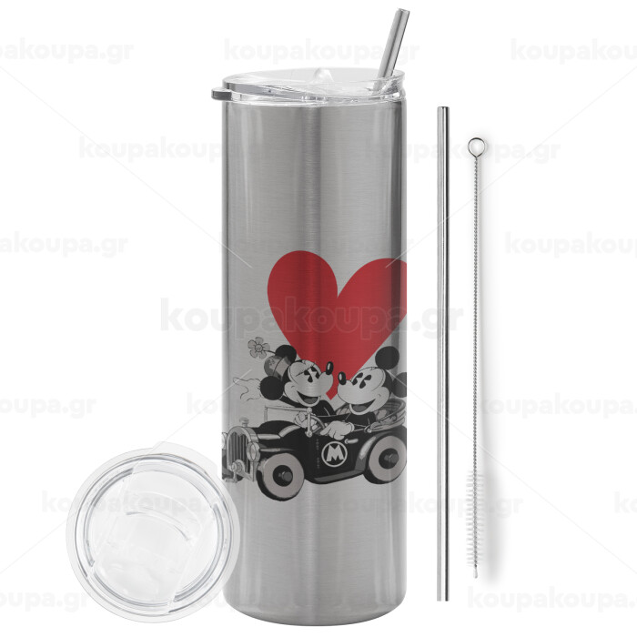 Mickey & Minnie love car, Tumbler stainless steel Silver 600ml, with metal straw & cleaning brush