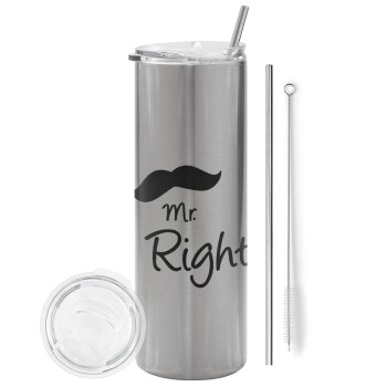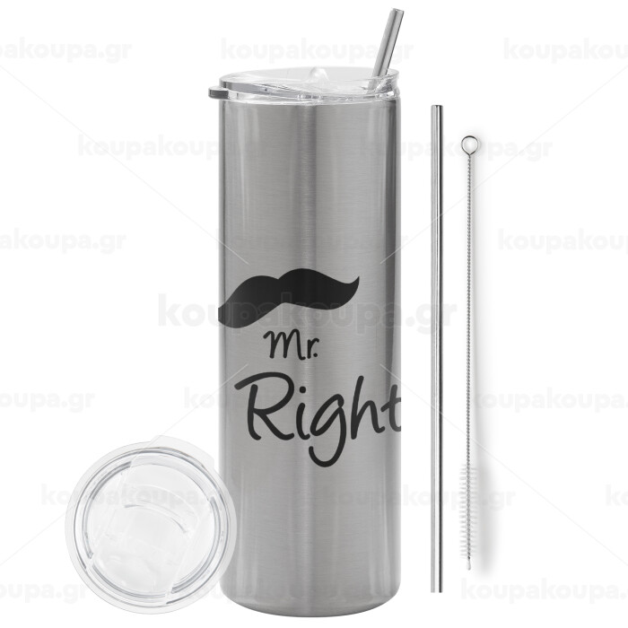 Mr right Mustache, Tumbler stainless steel Silver 600ml, with metal straw & cleaning brush