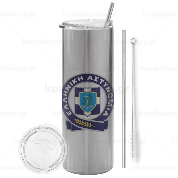 Ελληνική Αστυνομία, Tumbler stainless steel Silver 600ml, with metal straw & cleaning brush