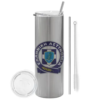Ελληνική Αστυνομία, Tumbler stainless steel Silver 600ml, with metal straw & cleaning brush