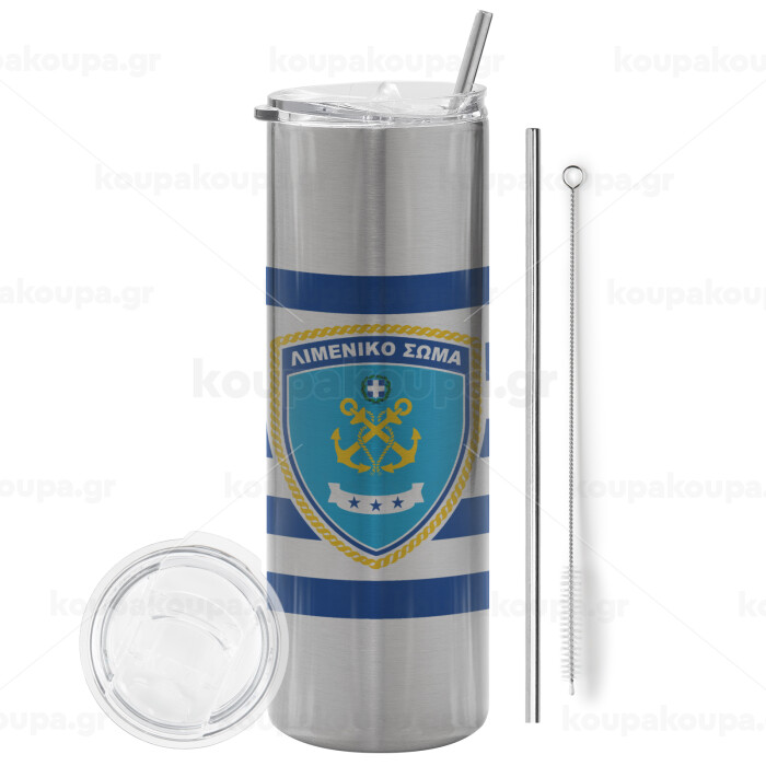 Hellenic coast guard, Tumbler stainless steel Silver 600ml, with metal straw & cleaning brush