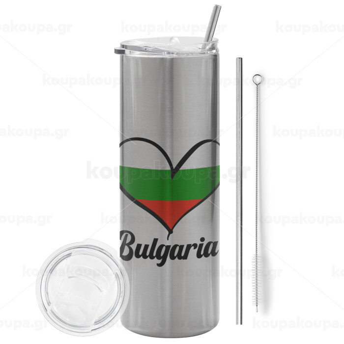 Bulgaria flag, Tumbler stainless steel Silver 600ml, with metal straw & cleaning brush