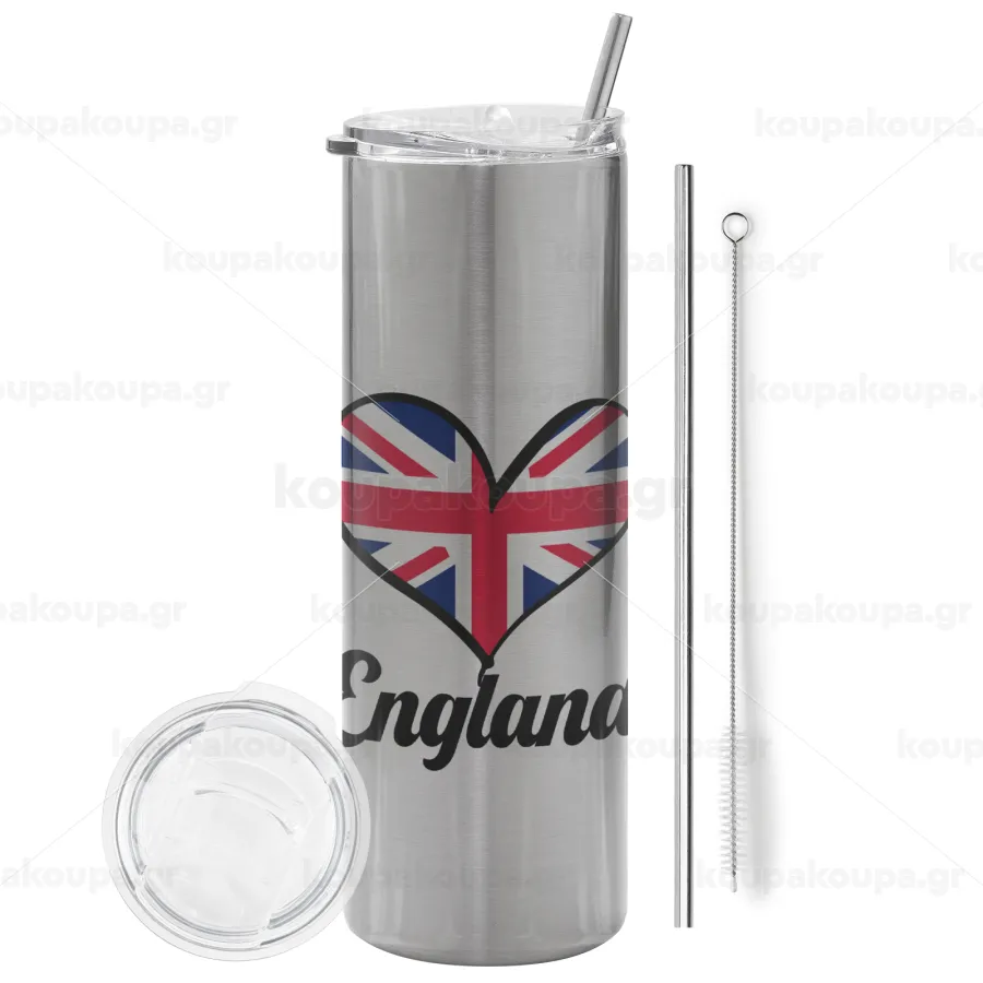 England flag, Tumbler stainless steel Silver 600ml, with metal straw & cleaning brush