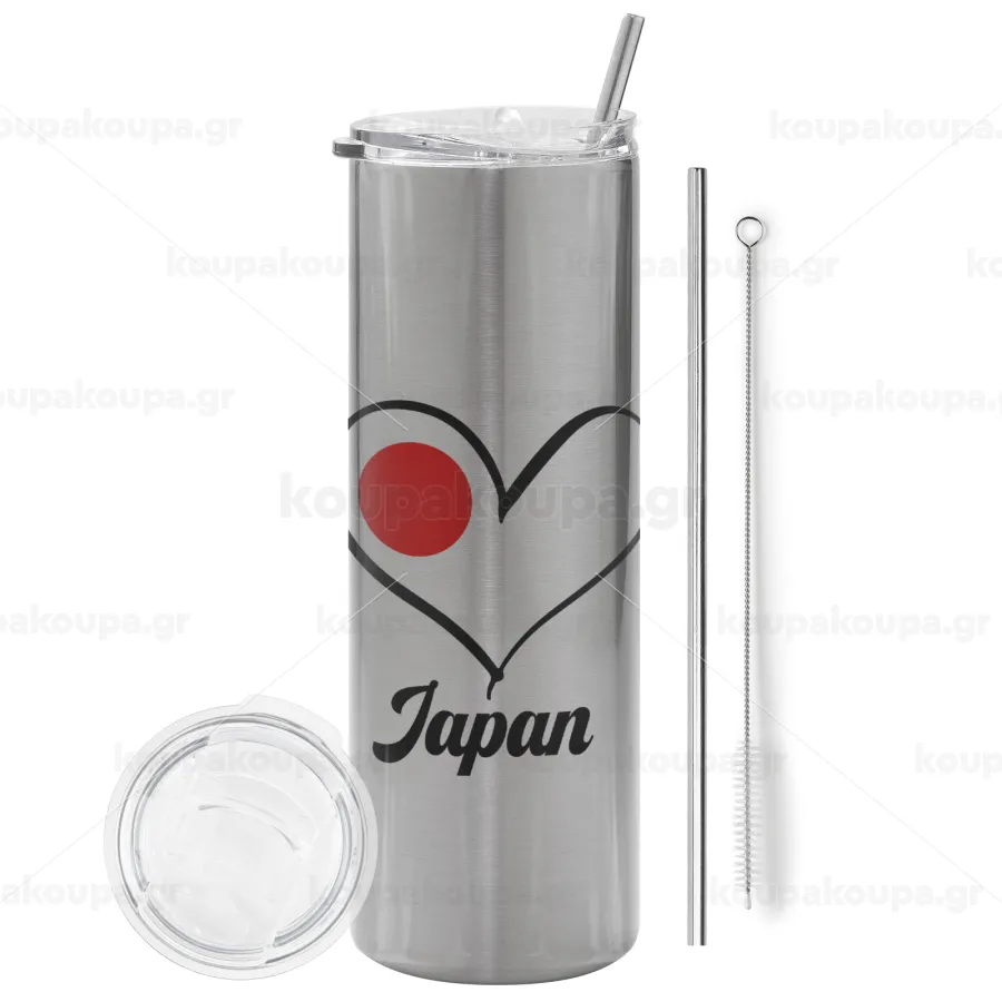 Japan flag, Tumbler stainless steel Silver 600ml, with metal straw & cleaning brush