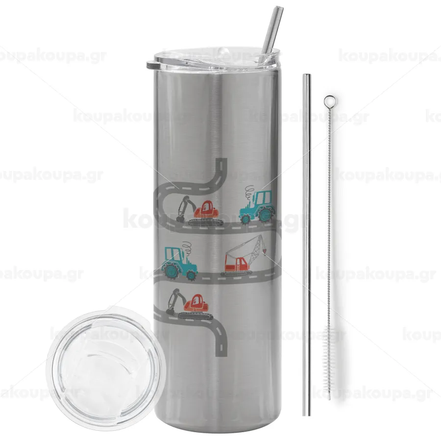 excavator along road, Tumbler stainless steel Silver 600ml, with metal straw & cleaning brush