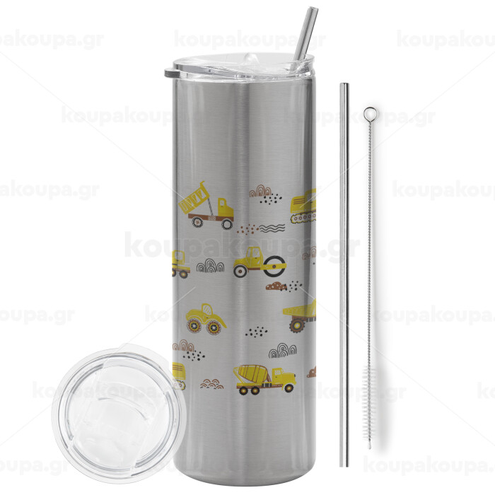 Car construction, Tumbler stainless steel Silver 600ml, with metal straw & cleaning brush