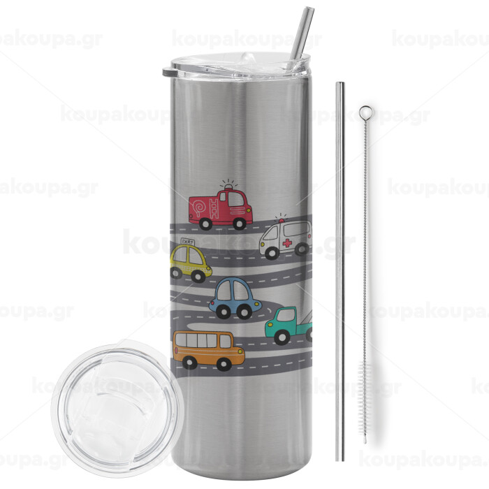 Hand drawn childish set with cars, Tumbler stainless steel Silver 600ml, with metal straw & cleaning brush