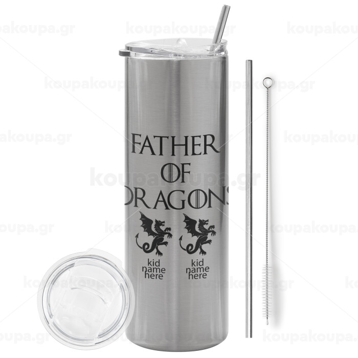 GOT, Father of Dragons (με ονόματα παιδικά), Tumbler stainless steel Silver 600ml, with metal straw & cleaning brush