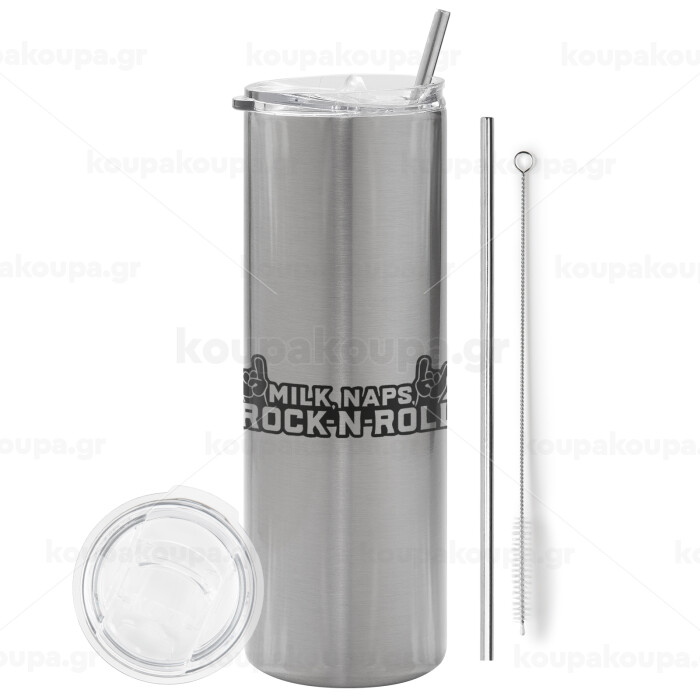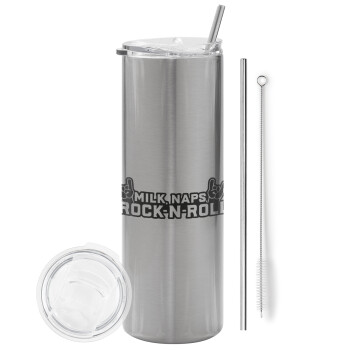 Milk, Naps, Rock N Roll, Tumbler stainless steel Silver 600ml, with metal straw & cleaning brush
