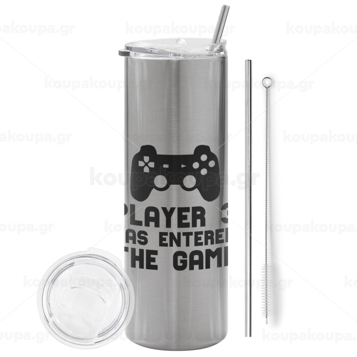 Player 3 has entered the Game, Tumbler stainless steel Silver 600ml, with metal straw & cleaning brush