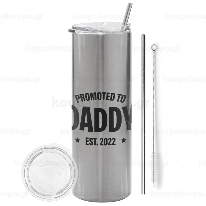 Promoted to Daddy, Tumbler stainless steel Silver 600ml, with metal straw & cleaning brush