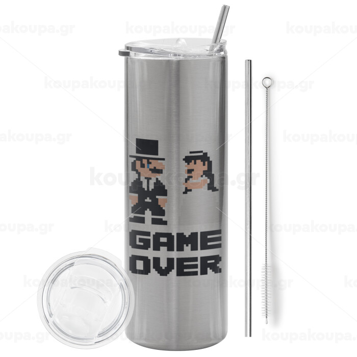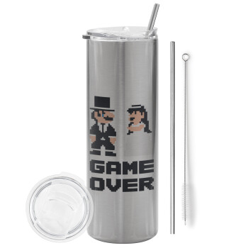 8bit Game Over Couple Wedding, Tumbler stainless steel Silver 600ml, with metal straw & cleaning brush