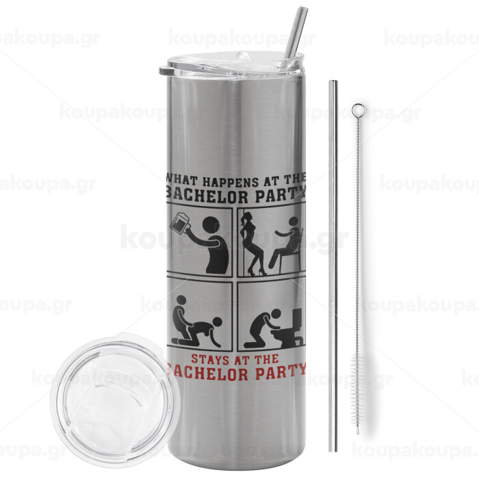 What happens at the bachelor party, stays at the bachelor party!, Tumbler stainless steel Silver 600ml, with metal straw & cleaning brush