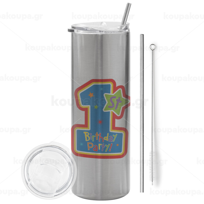 Happy 1st Birthday, Tumbler stainless steel Silver 600ml, with metal straw & cleaning brush