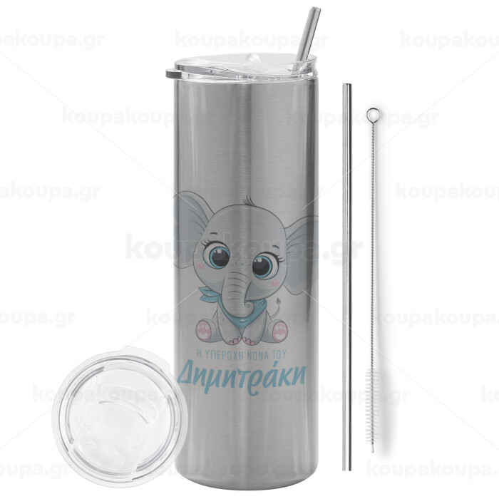 Η νονά μου, ελεφαντάκι γαλάζιο, Tumbler stainless steel Silver 600ml, with metal straw & cleaning brush
