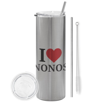 I Love ΝΟΝΟΣ, Tumbler stainless steel Silver 600ml, with metal straw & cleaning brush