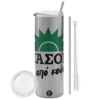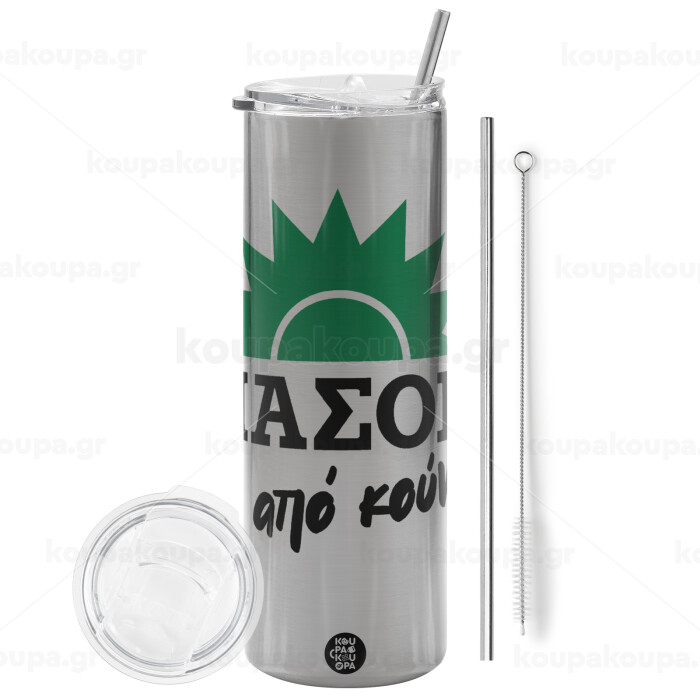 ΠΑΣΟΚ από κούνια, Tumbler stainless steel Silver 600ml, with metal straw & cleaning brush